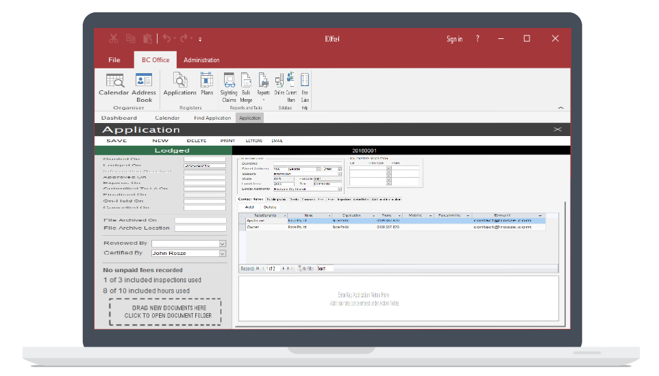 Record all your application contacts, checks, documents, fees, inspections in the application register