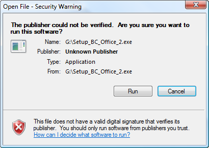 If you have Internet Explorer 7 or above installed you may receive a ‘Security Warning: The publisher could not be verified.‘ message while trying to open the BC Office Setup program.